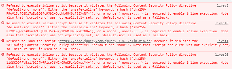 테스트창에 default-src 'none' 입력시 웹 개발자 도구에서 다음과 같은 에러 확인가능.