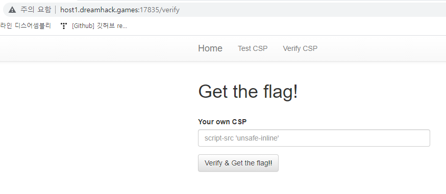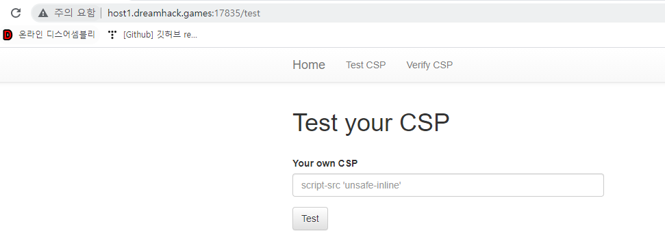 각각 CSP를 테스트해볼수 있는 화면과 flag를 얻는 화면이 존재한다.